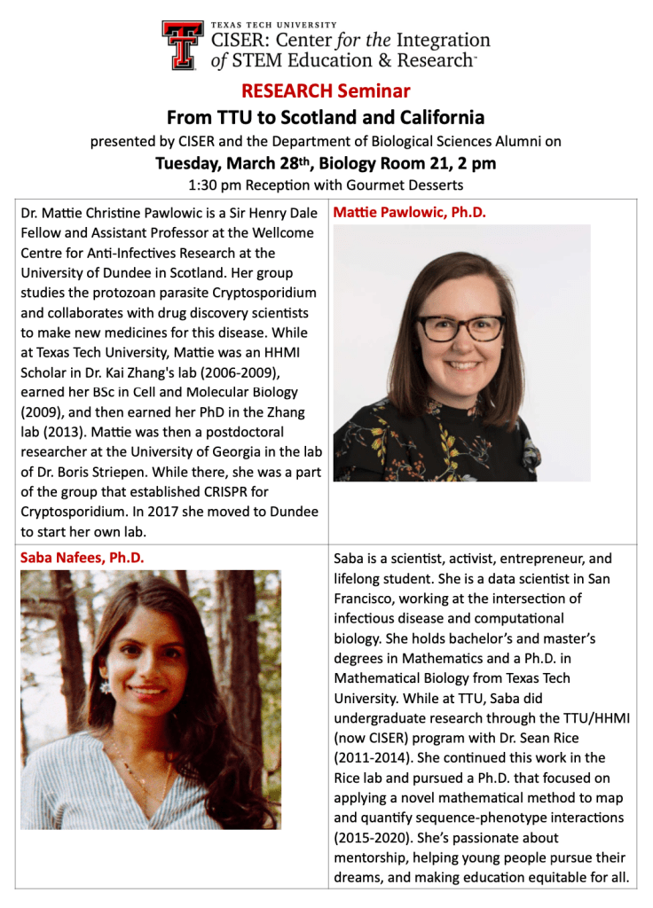 It was a real thrill to share a seminar slot with Dr. Saba Nafees. She was an undergraduate researcher in the same program while I was finishing my PhD. Saba was in town to accept a “Rising Innovator” Award from Texas Tech University College of Arts and Sciences. It was great to hear about her research working at the Chan Zuckerberg BioHub, and about her advocacy projects.
